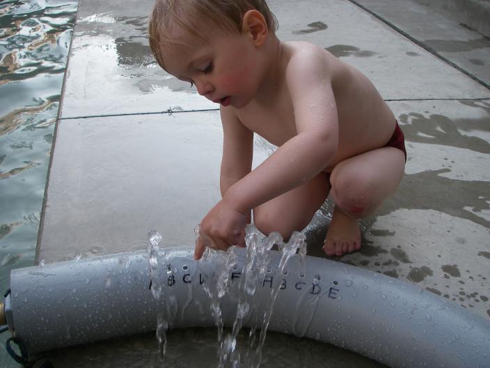 Father playing on Nessie while big fountain is running