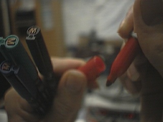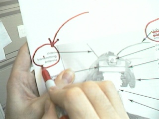 One computer goes to the big screen projector and runs a Web broswer that's pointed to my right eye (e.g. visits my EyeTap site). A second computer runs sfspeaker (SpeakFreely) and is connected to the PA system, and is responsive to the microphone array of my apparatus. A third computer runs sfmike and is set up so that I can hear the audience, their reactions to my lecture, and such. The third system sends the sound back to me, so that I can get audience feedback without acoustic feedback (e.g. I can hear the audience without getting the screech or squealing sound of positive feedback run amok).